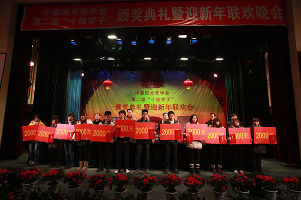 2011年12月30日,日照校區(qū)“中泰陽光”獎學(xué)金,第二屆“十佳學(xué)子”頒獎典禮在音樂廳隆重舉行。牟建董事長參加了此次典禮并為獲得“中泰陽光獎學(xué)金”的同學(xué)頒發(fā)獎學(xué)金。